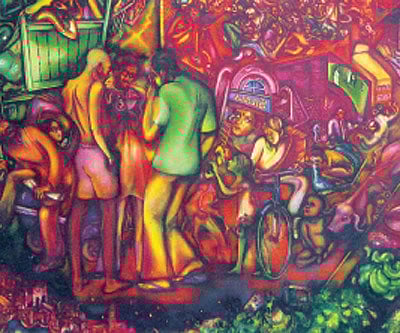 As an Indian artist Sheikh himself has reacted strongly to the environment around him, and in his largest painting entitled “City For Sale” (in the collection of the Trustees of the V & A Museum) on which he worked for three years, the main theme is Hindu-Muslim riots, urban brutalisation, its agonies and anguish. His paintings during the Emergency also document his sharp reaction to events and environment.