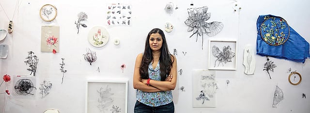 Floral representations accompanied by bees and birds were exhibited within glass cases and frames at Art Houz in Chennai. Visually, these challenged the viewer in its identification as either line drawings or prints. But a closer look revealed embroidery as a medium, which was made from silky threads on a base that was almost invisible.