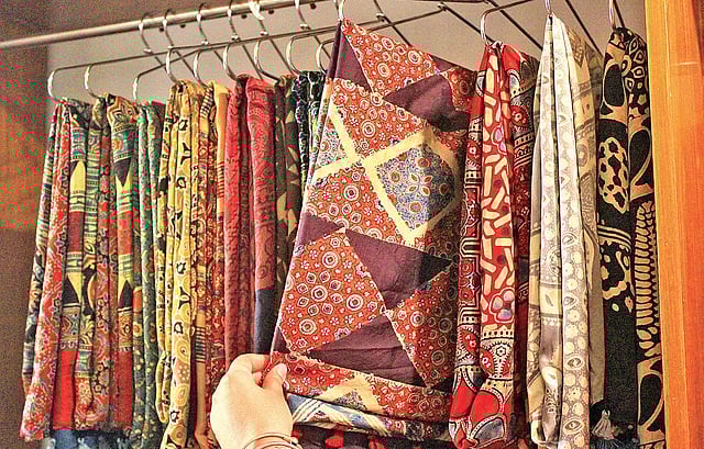 “Ajrakh is a time-consuming process. It is done on fabrics such as cotton, wool and silk. First, the textile is washed to remove starch. Then it is immersed in a mixture of camel dung, soda ash and castor oil. It is semi-dried and the process is repeated about 9-10 times,” says artisan Abdul Razzak, who works at Ismail’s workshop that is two-minute drive away from the emporium. “Cherryplum, which acts as a mordant, is used to wash the clothes before drying them in the Sun.”