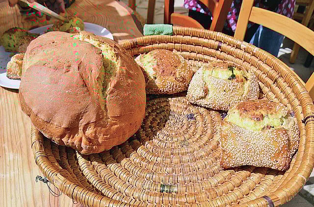 Maria is busy preparing traditional bread in Choirokoitia—a historical village in the district of Larnaca in Cyprus. She mixes flour, salt, water and yeast in a wooden trough to make the dough which is then kept aside for a minimum of 30 minutes for the yeast to rise. A local way of checking whether the dough is ready is by putting a finger in it. If the finger is pushed back by the rising dough, it is ready to be baked.