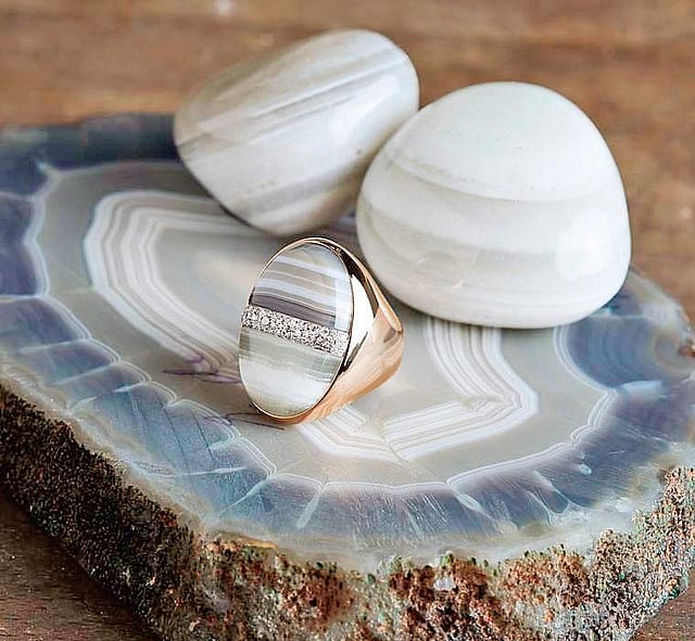 So, there’s Sturm und Drang, where bands of malachite mysteriously match those of black agate, in harmony yet in a different key. In the Deserto Ross ring, the earthy lustre of red jasper with a crack like parched earth glows below the blazing light of Tiger’s Eye.
