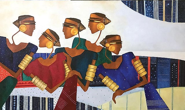 Like the master, the pastoral is Prajapati’s palette, her women dark-skinned and traditional in paintings done in earth colours. But the similarities end there. Bharti’s women have elongated necks and limbs. They preen in ethnic jewellery and textiles unique to Gujarat.