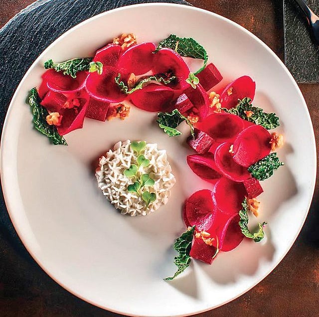 Colour forms the backbone of this plating aesthetic. Saffron for an orange hue or turmeric for yellow, red beets made into a puree or purple cauliflower used for a fuchsia pigment, it all about coordination and contrasts. “Vivid edible flowers and microgreens are generously used to jazz up a dish,” says Hoon. The Panch Phoran Salad by her is wherein she has added Egyptian blue and crimson coloured flowers to her salad. Arranged in a crescent, it creates a garden of farm-fresh ingredients.