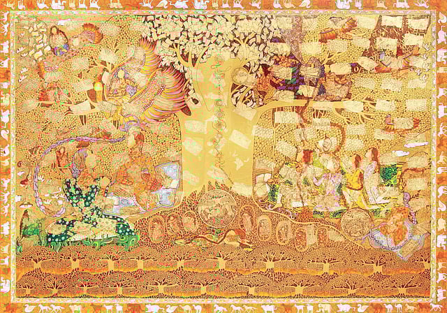 Kohli who admits that she doesn’t “do any sketches at all. Whatever I feel like from within, I let it just flow” believes in creating stories that reclaim the lost feminine narrative in cultural history. ‘Tat Tvam Asi’ displays works that are diverse in range, yet collectively portrays the message of the oneness of humanity. There are, of course, the famous Golden Womb pieces, with the overarching theme of regeneration of life. The tapestry here throbs with a life of its own.