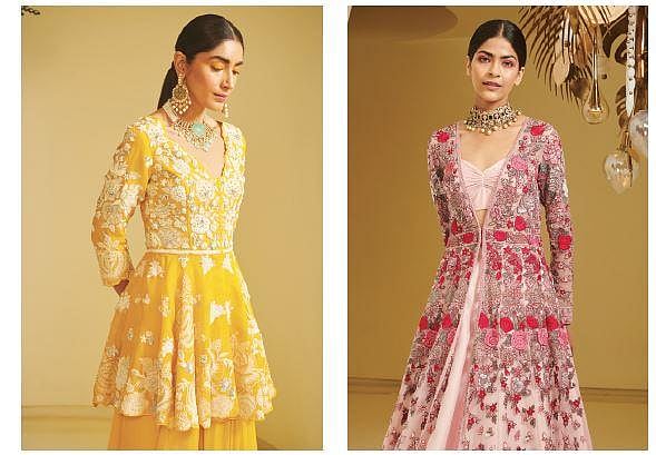 The silhouettes—from anarkalis, gowns, lehengas, shararas, saris and capes with shararas—seamlessly weave in the shades of summer with floral motifs on fabric as varied as organza, tulle, chiffon, silk and georgette.