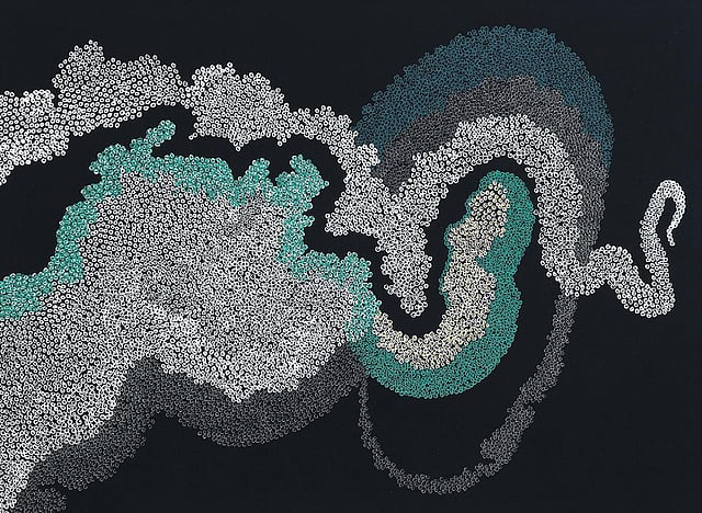 A recipient of the Ravi Jain Memorial Annual Fellowship Award 2021 by Delhi’s Dhoomimal Gallery, Garg explains with great gusto how the human body has influenced her art. The human body is supposedly made of over 37 trillion living cells. While each cell looks almost identical, their functions and the hereditary material they contain keep transforming continuously. Garg believes that human cells are therefore a reflection of our constantly changing environment and the way we perceive things. This belief plays out in her tightly structured paintings, which consist of a smattering of colourful beadlike shapes displayed on stark black backgrounds.