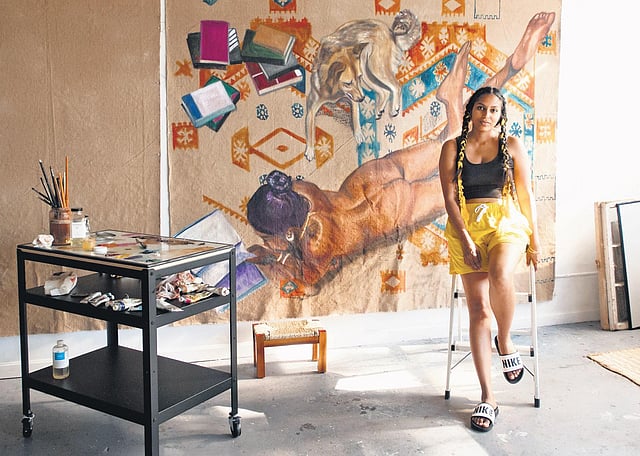 Audre Lorde’s Black Unicorn, and books by Kaifi Azmi, Emily Dickinson were displayed on a side table by the bed in the gallery where her studio was recreated at the exhibition. “All these works were made ‘in bed’ and alongside poetry,” the artist says. Exposure to multiple cultures engendered her brand of politics. Her “paintings are done from life”, says the artist, who was never formally trained, but she did go in for open drawing sessions at Art Students League of New York and was “always interested in cloth and weaving”. She continues to take weaving lessons at Fulia in West Bengal and Delhi.
