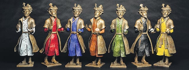 The stately statues are emblematic of a sovereign in celestial rapture: each Humayun head has a regal tilt as the figure contemplates the planet held in its raised hand. The intricately designed, delicately embroidered robes, jamas and belts differ in colour and design, setting each one apart: white on Monday for the moon, red on Tuesday for Mars, blue or purple on Wednesday for Mercury, a yellow colour of metals like gold and copper for Thursday inspired by Jupiter, green on Friday for Venus, black for Saturn on Saturday, and a resplendent yellow for the sun on Sunday.