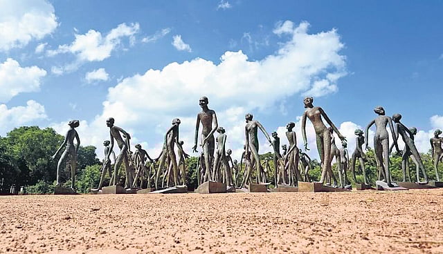 For now, sculptor KS Radhakrishnan is in the Bronze Age. At his first-ever retrospective, the front lawn of Delhi’s Bikaner House is populated by a horde of ‘bronze people’, caught in motion. Named The Crowd, the massive installation of 50 figures, each six feet tall, brings to mind Polish artist Magdalena Abakanowicz’s fibre works. While both depict people frozen in time, Abakanowicz’s works are regimental compared to the effortless fluidity in Radhakrishnan’s figures. The space between the figures invites the viewer to step into a surreal dimension, and be one with the crowd. The exhibition, On the Open Road, mounted by Gallerie Nvya, covers five decades of the Delhi-based artist’s work.