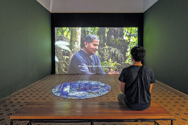 Among the most striking pieces is Swiss artist Ursula Biemann’s ‘Forest Mind’a video installation that is the outcome of her continued interaction over the years with the Inca community of the forests in Colombia. It captures the tribals talking about why their forests hold a godly place in their lives. They speak about folktales, their personal journeys and how the wilderness is their protector. They also talk about the gradual erosion of their homes.
