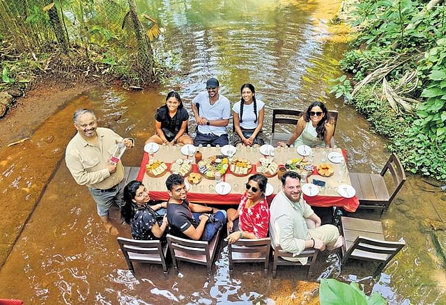 Under his guidance, the ‘Floating Feni Experience’ commences with a stroll through the verdant cashew plantation. Much like the curated wine experiences at the vineyards of the nearby Nashik region, and the wine tours in Napa Valley and Tuscany where the itinerant vino maven can head for home with a bespoke bottle clutched in one hand and grape juice stains on sandalled feet, now Goaphiles can become feni-cianados at the distillery. They are taken through the feni-making from fruit-crushing to distillation in earthen pots buried in the ground. The highlight of the experience is the tasting, conducted at a setup in a natural spring, where you dip your bare feet in the cool water while being seated at a community table with fellow guests. It offers a sensory exploration of three expressions of feni—cashew, coconut and Dukshiri, made from the roots of a rare plant.