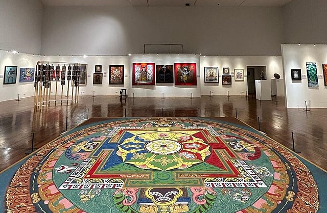 At the heart of the display titled Where the Deities Reside comprising 76 artworks lies a massive floor mandala, created with coloured sediments. Its expanse is covered with earthy tones of reds, yellows, greens, blues, browns and pinks to create intricate wheels, vases, victory banners, conch shells and elements of nature that embody the spiritual journey of the soul through many lifetimes. This larger-than-life exhibit sets the tone for the rest of the works on display—paintings, straw art, wood installations, statues that use lost wax and repousse techniques filigreed with semi-precious stone inlay, ceramics and more—as being reflective of the deeply spiritual nature of this country.