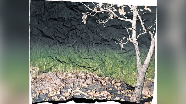 A close observation reveals that the paper on which each image is printed is crumpled, with prominent creases. These render the photographed terrain an uneven texture. “Again, it is something I just stumbled upon—crushing the paper in my fist and then opening it to see if the design reflects a landscape similar to the actual area. The idea was to add a level of abstraction and create a relic out of it; or to imply the act of discarding,” explains the artist, who is also showcasing another three-work series that lends the exhibition its name. All works are priced between Rs 1,20,000 and Rs 3,00,000.