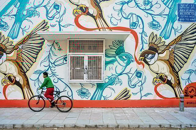 For some, the political is personal. Pune-based Kartikey Sharma, who has survived cancer twice, channels his journey into deeply participatory murals. “My work invites people to talk, learn, and break silence,” he says. Others arrive at politics almost inadvertently. Indore-based Bhumika Sharma Raghuwanshi, who began painting murals simply to beautify neighbourhoods, discovered that ecological themes like her widely loved sparrow mural took on unexpected political weight in a country reckoning with shrinking biodiversity. “I used to think art had to be framed,” she says. “But when I painted my first wall, I knew this is where I belong. On the street with people.”