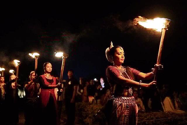Curated by Delhi heritage organisation Sopaan, the evening follows a musical composition that builds into a thunderous, voice-of-God narration. Dancers enter from behind the audience, bearing fire-lit torches, culminating in Omkara. The show took place during AIKYAM, a festival celebrating Indian cultural heritage in collaboration with UNESCO and the Department of Tourism, Maharashtra.