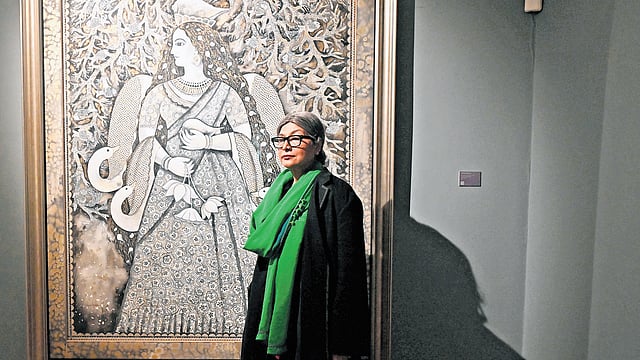 The feminine form, ‘Shakti’ is the leitmotif of the show. Why are no men in her larger-than-life paintings? “That’s not true,” she protests. “Yes, I do paint only the female form, but isn’t the male a part of the female too? Had Bramha, Vishnu, Maheshwar not been there, would there be Shakti? I come from West Bengal, where the festivals are largely centred on women—Durga, Kali, Lakshmi—and that’s what appears on my canvas,” says the 64-year-old artist. It’s a dreamscape that she paints—filled with minute details. This time most of the detailing is with cowries and shells, beside the mermaids drawn from mythology, their tails twisted like interrogations of metaphors.