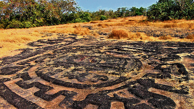 A faint curve catches his eye— a smooth depression, too deliberate. What looked like random lines resolve into form: a massive elephant etched into the plateau, nearly 50 feet long and 48 feet wide. Within its stony silhouette swarm dozens of smaller figures such as stingrays, fish, clawed animals, shapes part-familiar, part-enigmatic. An entire world, carved not into rock, but into time. These are the Konkan geoglyphs: ancient rock carvings spread across Ratnagiri and Sindhudurg districts. Over 200 such sites have been documented so far, often located on laterite outcrops a few kilometers inland from the sea. Most are unmarked, undocumented, and unguarded. You could walk right over them and never know.