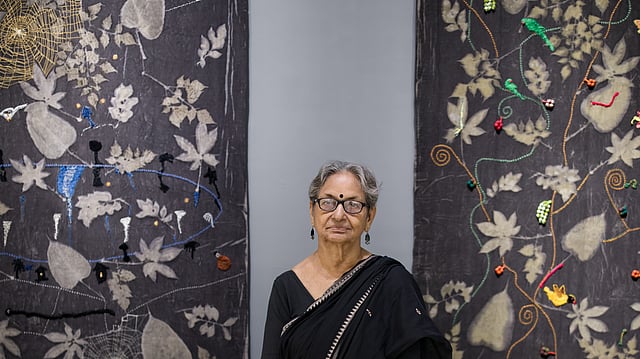 Admittedly, there’s something charmingly old-fashioned about her creative process. In the age of 3D printing, Choudhury finds joy in the simplicity of eco-printing. Where most contemporary artists rely on industrially-produced pigments, here’s a woman who produces her own natural colours, often derived from organic sources. Unlike her last major retrospective—the Nancy Adajania-curated The Dark Edge of Green at Emami Art in 2022—which was more autobiographical in nature, Aranyaka is a plea for environmental crisis and loss of biodiversity. “Aranyaka is more concerned with the artist’s outward, social self than her inner, psychological one,” remarks Richa Agarwal, CEO, Emami Art.