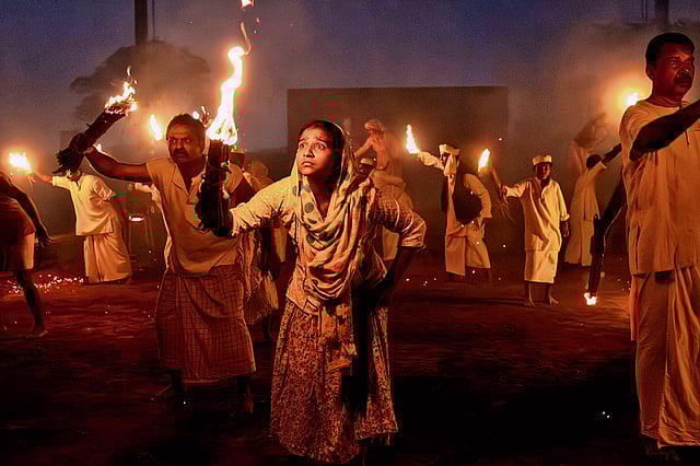 Performers move through the space with unhurried certainty, their feet brushing past the audience, silhouettes swelling and dissolving in firelight. The staging borrows from ritual rather than realism—echoes of Theyyam, folk processions, village ceremonies—where performance is not observed from a distance but absorbed through proximity. The audience is not seated safely outside the story; it is caught within its orbit.