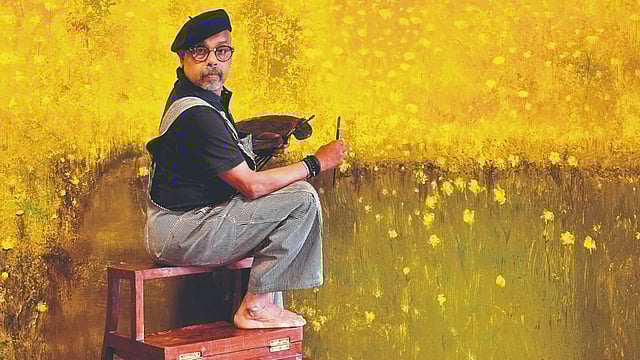 The exhibition marks his next major public showing following the widely attended Infinite Light exhibition at Bikaner House in 2022. Yet Luminous Terrains is less a sequel and more a deepening of the artist’s lifelong dialogue with nature. Maity has long been drawn to places where landscape, culture, and memory intersect. And the canvases as always are monumental and filled with colours. “I like painting in the day because then you can capture the real beauty of light. Also, the scale excites me. It is difficult to work on a large scale. Your imperfections and mistakes become magnified. This is a challenge I love taking up each time,” says the 61-year-old artist.