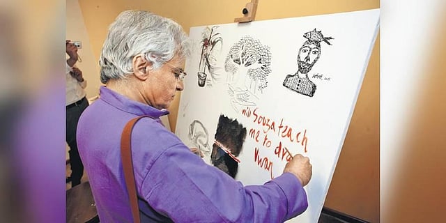 An intellectual of serious merit, he amused me when joining a bunch of artists who were painting on a canvas to mark the conclusion of a DAG exhibition titled ‘Continuum’ dedicated to the Progressive Artists’ Group, he dipped his brush into a pot of red paint and wrote, “Will Souza teach me to draw” before drawing a straight line from top to bottom, and then inscribed on its side: “to a straight line”.