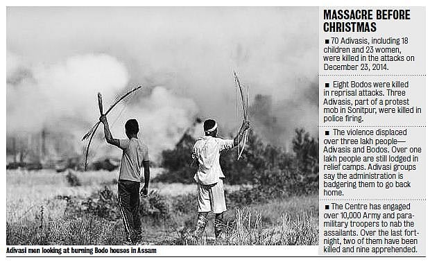 Last month’s terror strike was the third major attack on the Adivasis since 1996 in the restive Bodoland Territorial Areas District (BTAD), which have been held to ransom by extremists over the last two decades. The latest massacre of Adivasis happened after a gap of 18 years, but, in 2012 and 2014, Bengali-speaking Muslims were the targets of two xenophobic attacks, which left over 150 dead and rendered several lakh people homeless. The violence in 2012 broke out following the killings of four former rebels by miscreants, which soon snowballed into a full-fledged ethnic riot between the Bodos and Bengali-speaking Muslims. Over 100 people, mostly Muslims, were killed in the outrage.