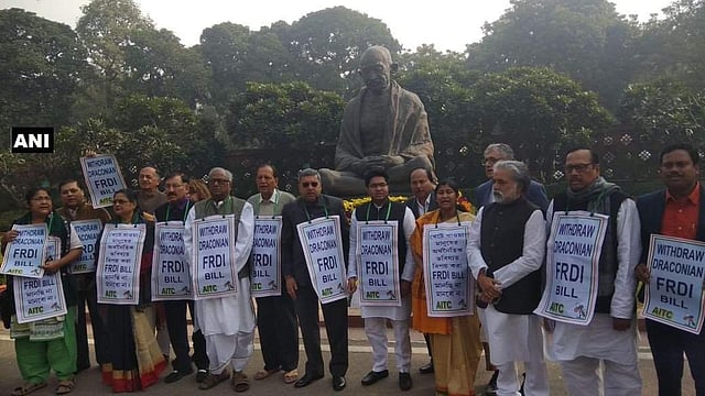 The party leaders held placards that read: "Withdraw draconian FRDI Bill", at Mahatma Gandhi's statue in Parliament.