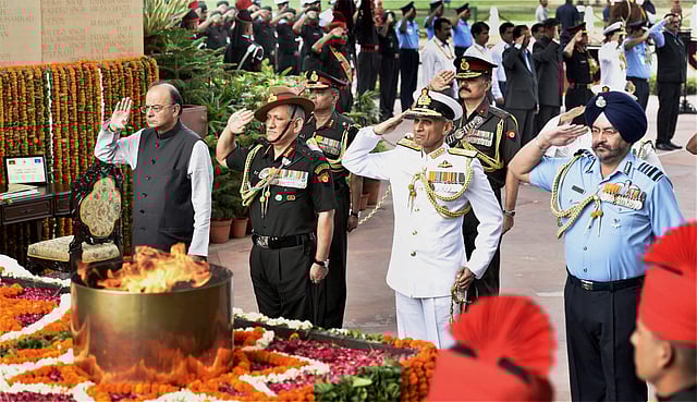 Jaitley, along with Army Chief General Bipin Rawat, Navy Chief Admiral Sunil Lanba and Air Force Chief Marshal B.S. Dhanoa, laid a wreath at the Amar Jawan Jyoti at the India Gate.