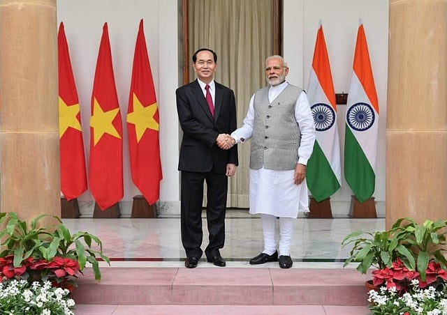 "PM @narendramodi welcomes Vietnamese President Tran Dai Quang on his first State visit to India at the Hyderabad House ahead of the bilateral talks. India and Vietnam enjoy warm and cordial relationship with common roots in history. #ActEastPolicy," he tweeted.