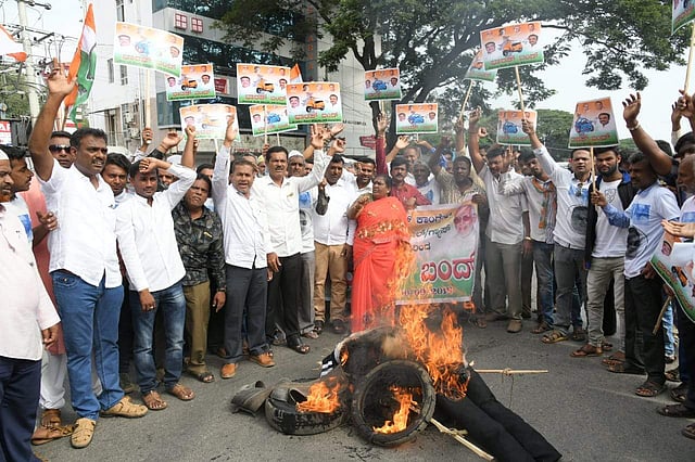 Roads in some areas, including Chhotaudepur and Surat, were blocked with burning tyres by protesting Congress workers while bus services were affected in many areas like Rajkot, Amreli and Ahmedabad.