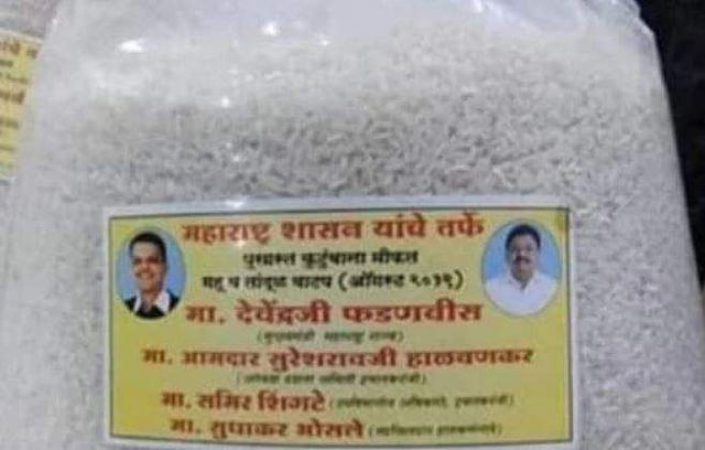 The stickers say "Government of Maharashtra, Free for the families of flood victims of August 2019 floods, Rice and Wheat" - with pictures of both Fadnavis and Halvankar, along with names of party activists Samir Shingte and Sudhakar Bhosale.