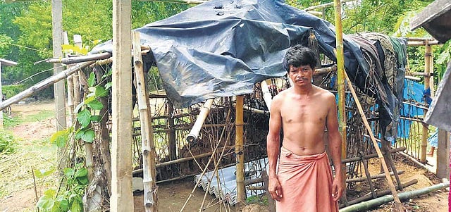 “I applied for a house to the local gram panchayat but I was not granted fund to construct a home. I am waiting when they will respond to my plea,’’ said 42-year-old Madhu, wearing a gamcha (towel) and standing in front of a bamboo-pole structure that he has constructed to build up a hut.