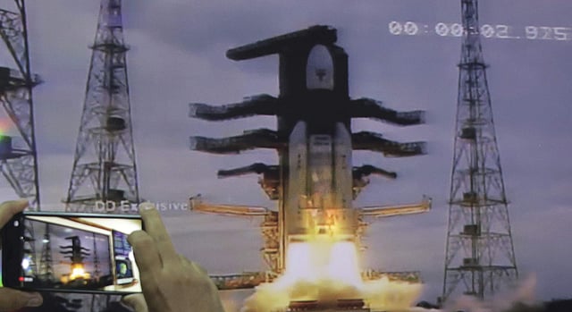 The rocket Geosynchronous Satellite Launch Vehicle-Mark III (GSLV Mk-III), carrying Chandrayaan-2, is India's most powerful launcher to date.