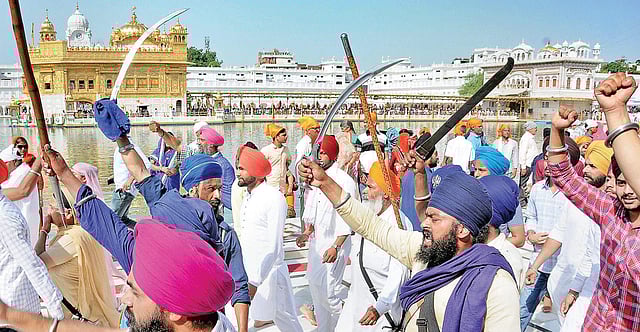 Turbans were tossed and swords were flashed as unseemly scenes played out in full public view on a day of commemoration. As soon as the Akal Takht Jathedar (highest temporal seat of the Sikhs), Harpreet Singh, finished his address and a kirtan started playing, the hardliners grew restive and disruptions followed. Pro-Khalistan supporters, chanting slogans and sporting T-shirts emblazoned with the image of slain militant Jarnail Singh Bhindranwale, tried to force their way into the area around the Akal Takht.