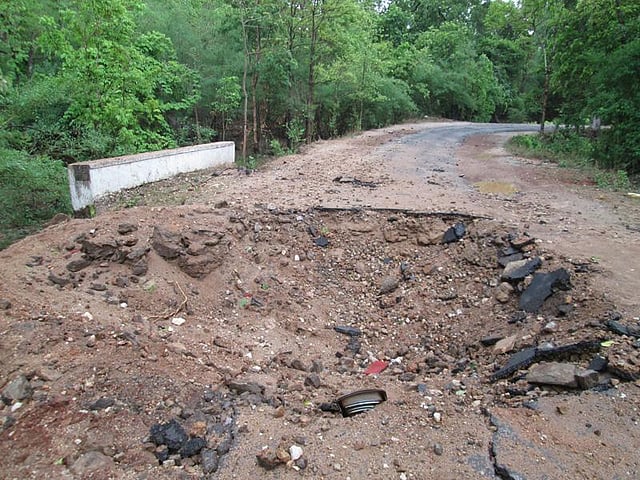 A deep crater-like structure formed on the NH-16 in Bastar after the IED blast triggered by Maoists.