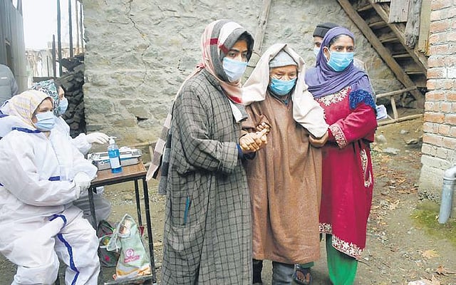 Braving the cold weather conditions, voters arrived at a polling station in Airwan, Nagri Block of Kathua this morning.