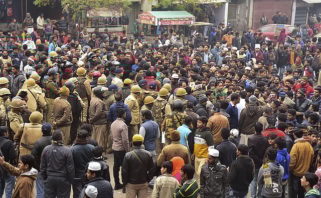 A large number of girls blocked all traffic within the AMU campus on Monday, forming a human chain at the main crossing near the university guesthouse, while at Shahjamal under the Delhi Gate police station, hundreds of women from the neighbouring localities continued with their round-the-clock sit-in that is going on for three days.