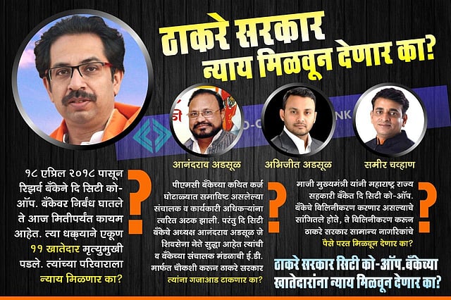 The posters that bore images of CM Uddhav Thackeray, Anandrao Adsul, his son Abhijit and close aide Sameer Chavan, asked whether the Thackeray government would do justice to the account holders of the bank.