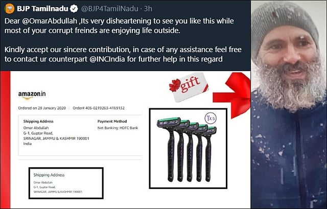 The tweet had a photo of an Amazon order of five razors dispatched in Abdullah's name to his Gupkar Road residence in Srinagar. The tweet read: "Dear Omar Abdullah, its very disheartening to see you like this while most of your corrupt friends are enjoying life outside."