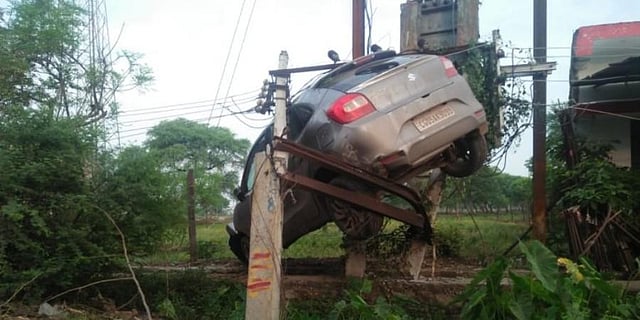 “Following a strong collision, the car jumped high in the air, hitting high tension cables and landed on the electric poles. All three persons inside had a miraculous escape with no major injuries. The car belonged to a businessman and his son was reportedly at the wheel”, Dhamtari additional SP Manisha Thakur told The New Indian Express.