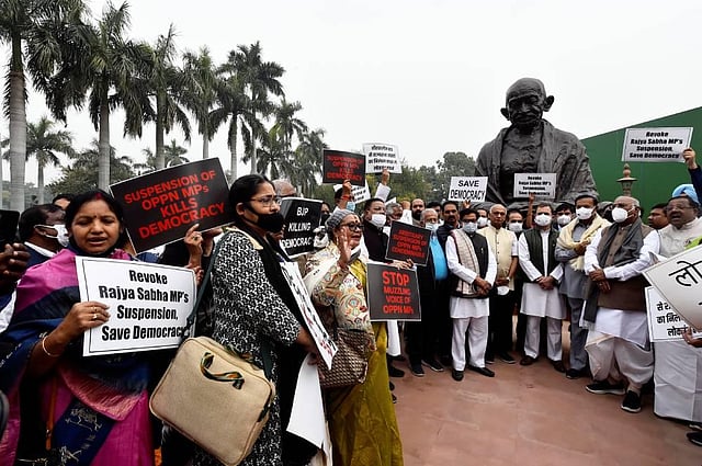 As many as 12 opposition MPs were suspended from the Rajya Sabha on Monday for the entire Winter session of Parliament for their "unruly" conduct in the previous session in August, even as the Opposition termed the suspension as "undemocratic and in violation of all the Rules of Procedure" of the Upper House.