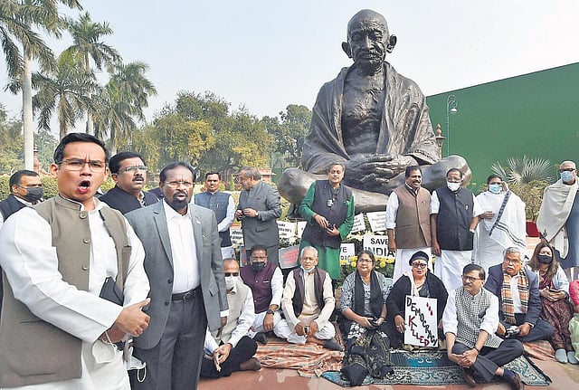 The 12 MPs continue to sit in front of the Gandhi statue in Parliament to protest their suspension but the Centre insists that either they should apologise or Kharge condemn their act inside the House.