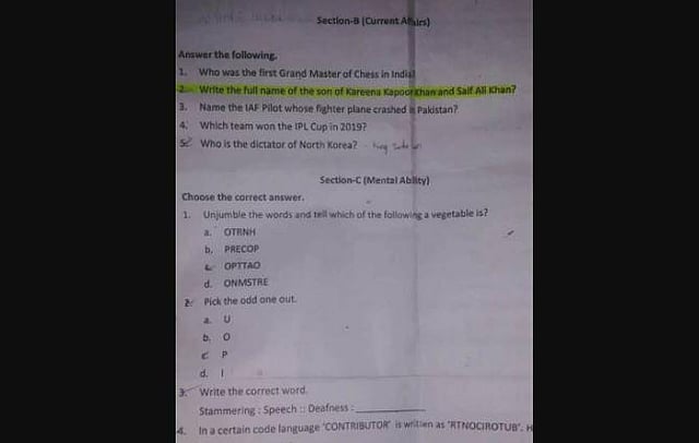 In fact, the Class VI Term End-II exam's General Knowledge paper's Current Affairs section contained five questions. The second question asked the students to write the full name of Kareena Kapoor Khan and Saif Ali Khan's son.