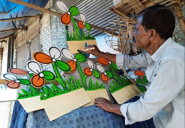 An artist makes party symbols with bamboos & paper at Dompara for an election campaign ahead of assembly elections, in Kolkata. (Photo | ANI)