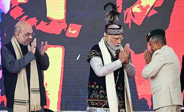 Prime Minister Narendra Modi, Meghalaya Governor Brig. BD Mishra (Retd.), Home Minister Amit Shah at the Golden Jubilee celebrations of the North Eastern Council. (Photo | ANI)
