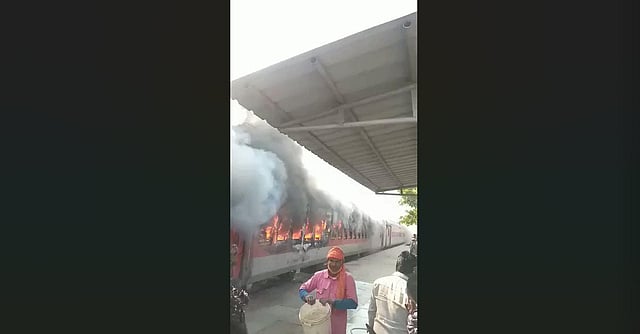 The train was empty when the fire broke out. There was no loss of any life or injury to anybody. Fire personnel has been pressed into service to douse the flames.