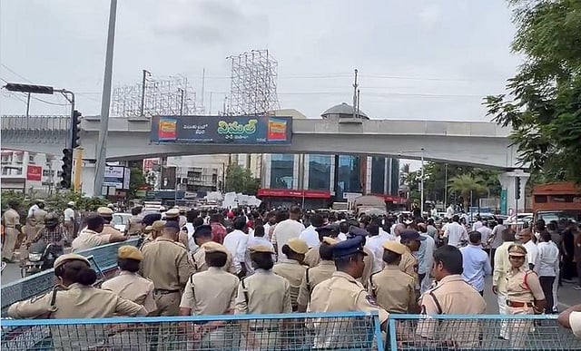 As the protesters gathered in large numbers at PJR Junction in Khairatabad, police tried to prevent them from proceeding further, which instigated the activists to torch motorcycles and damage buses in that area.