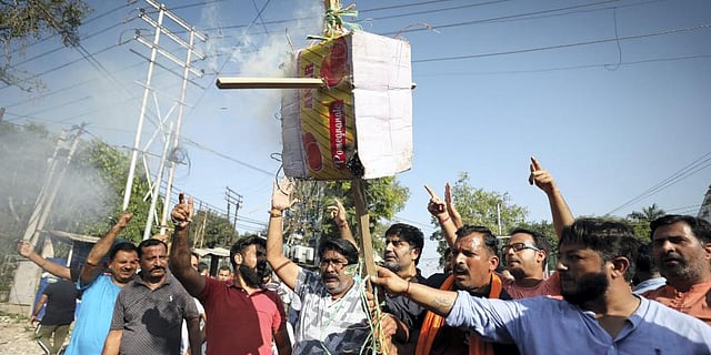 Rashtriya Bajrang Dal activist also joined the protesters and set ablaze an effigy of Pakistan to condemn the frequent target killings by terrorists in the valley.