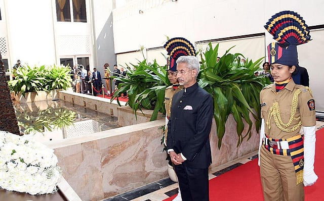 External Affairs Minister S Jaishankar pays homage to the victims who died in the 26/11 terrorist attack at Hotel Taj Mahal Palace, in Mumbai. (Photo | ANI)