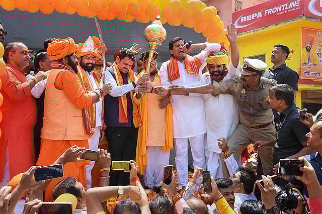 Shinde's supporters were seen carrying saffron flags with the Shiv Sena's election symbol. From the helipad, the Maharashtra CM, accompanied by Deputy CM Devendra Fadnavis and his cabinet colleagues, held a massive road show on their way to Ram Janmabhoomi premises for the darshan of Ram Lalla.